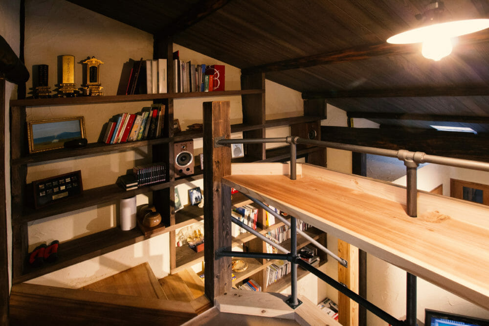 ご主人の強い思いから実現した天井まである本棚。 "知的雑多"な感じ!? 材料にもこだわって無垢の一枚板で作りました。 割れや反りも木が生きている証拠。
