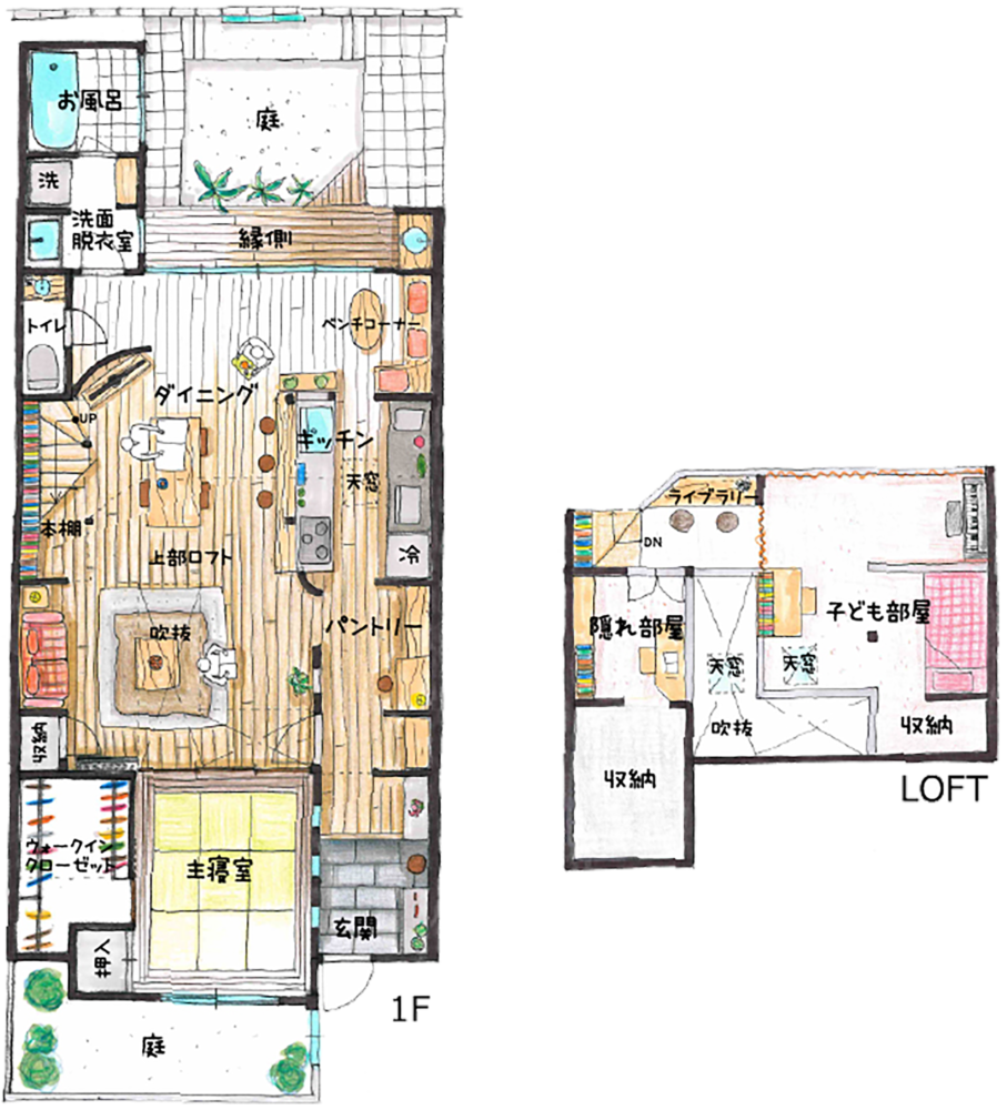 1Fリビングの真中は窓の光が届かないので、2階の床を分割し吹き抜けから屋根のトップライトの光が1Fに落ちるように工夫しました。
