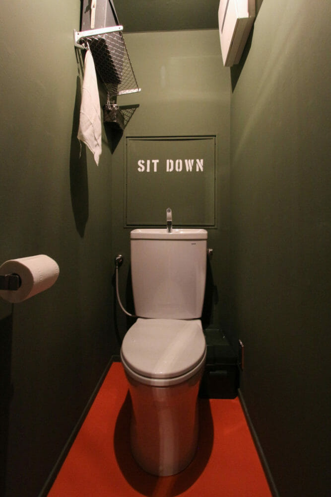 空間ごとにテーマが違うK様邸。トイレは戦場(洗浄)!というご夫婦のアイデアでアーミー調にMA-1をイメージしたカラーを取り入れました。