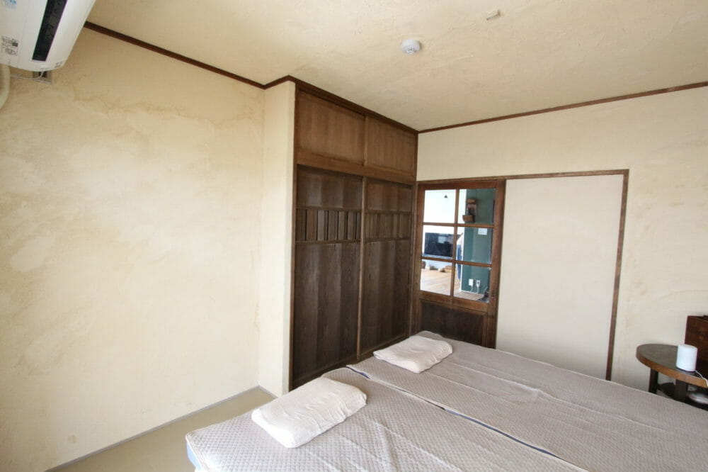 壁はもちろん、天井まで漆喰(DIY)を塗ったことで洞穴のような雰囲気の寝室になりました。熊が冬に巣ごもりをするように、明日の「おいしい」のために体を休める場所。インターネットで見つけた古建具もお気に入り。