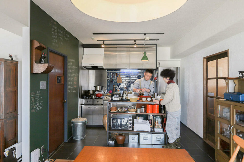 既存のキッチンの扉にステンレスを貼り、古道具屋さんで手に入れた取っ手を付けてオリジナルのキッチンに♪強い火力のコンロを設置して、元料理人のご主人も納得の使い勝手になりました。