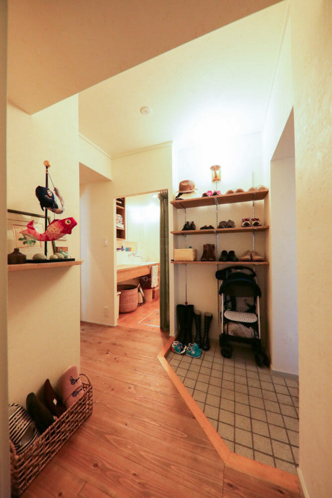 可動式の靴棚は状況に応じて高さと枚数が変えられます。帰宅してすぐに目に付く飾り棚には季節を感じる小物やお子さまの作品を飾ってホッとするスペースに♪