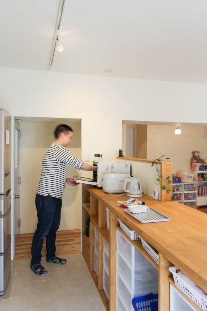 対面式のカウンター下には家電や食器などがスッキリ収まります。十分な広さがあるので、料理の盛り付けにもとても便利。