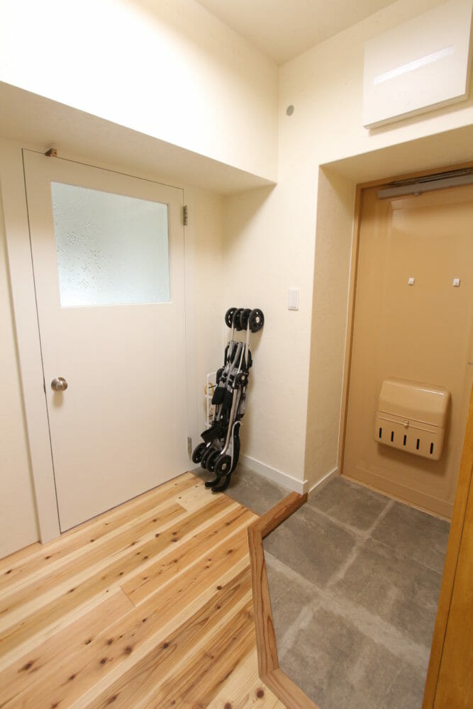 ゴチャつきがちな玄関ですが、フローリングの一部にベビーカーや傘を置けるスペースをつくり、いつもスッキリとした玄関に。