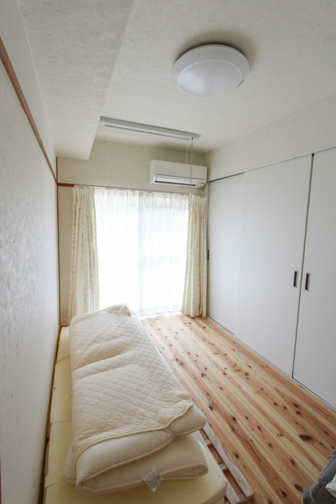 和室だったお部屋は壁一面に大容量のクローゼットを備えた主寝室に。 杉の無垢フローリングは調湿性があり、結露対策も抜群!