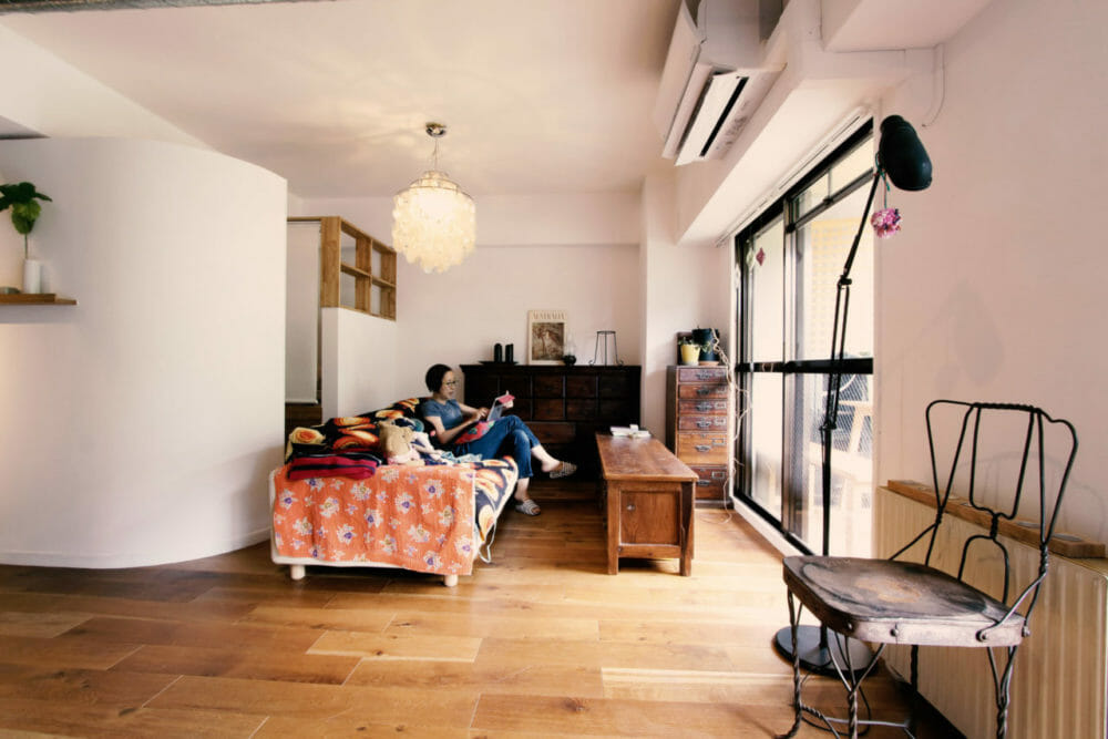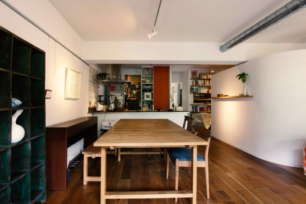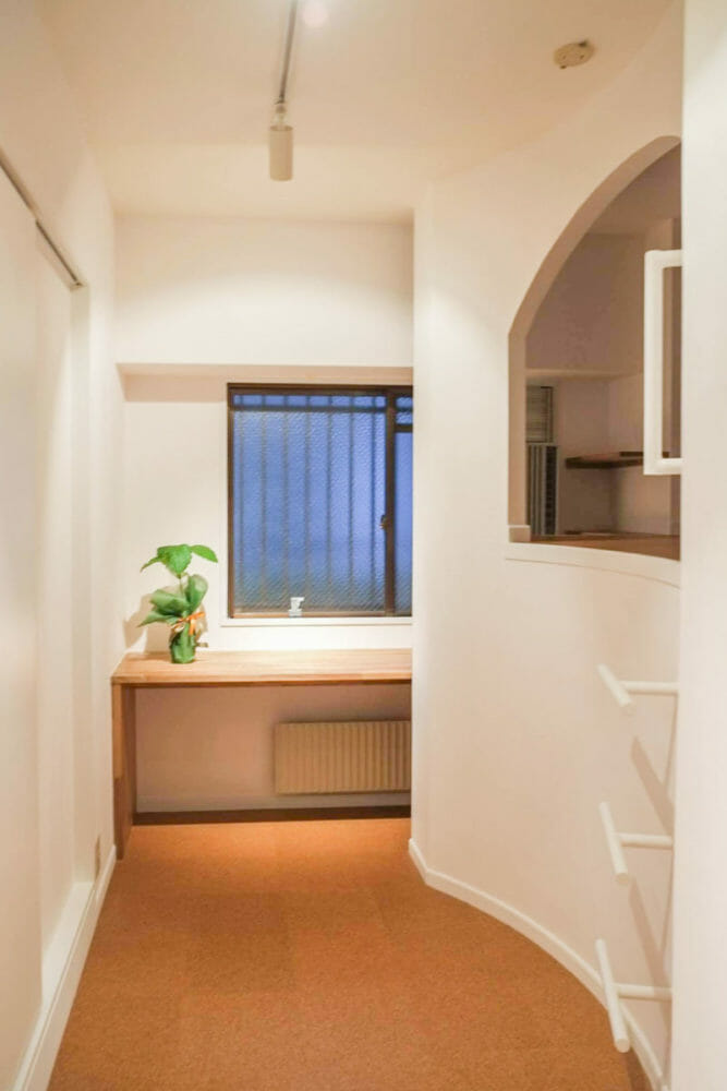 アールと白い余白が、物が増えがちなダイニングキッチンにほっとする空間を作ります。 アールの壁の裏にはクローゼットと寝室が隠れています。