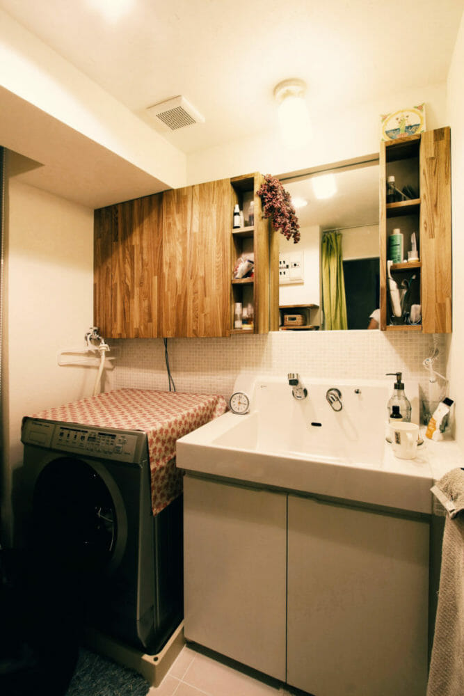 もともとあった、洗面台を使いつつ、収納つきのミラーを造りつけました。 ミラーで広く見える上、片付きやすい洗面脱衣所に。