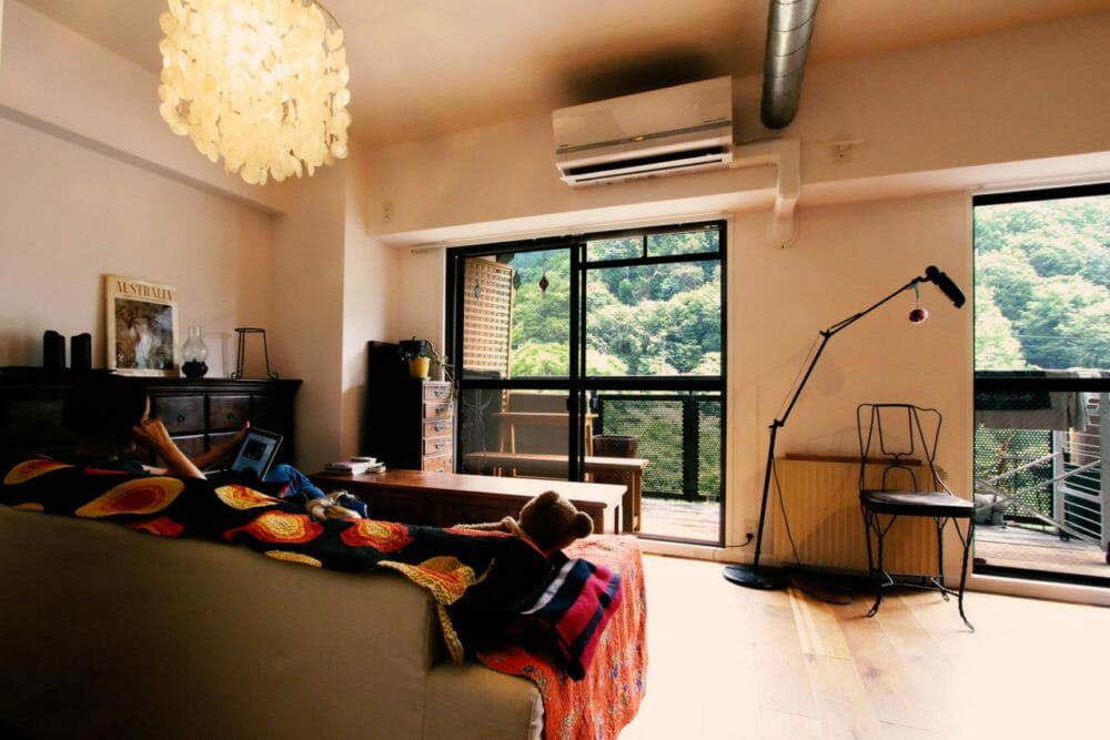 八瀬の美しい緑のパノラマを堪能するリビング。