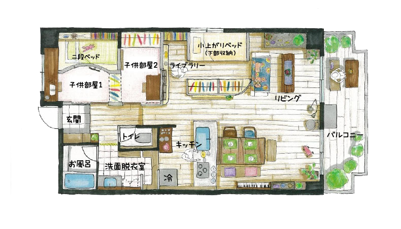荷物の使用や用途を見直し、取り出しやすく片付けやすい工夫と、縦の空間を最大限に生かしたロフト使いで2つの子供部屋を確保し、無駄なくスッキリ片付く心地良い空間ができました。