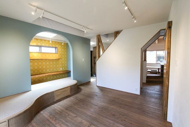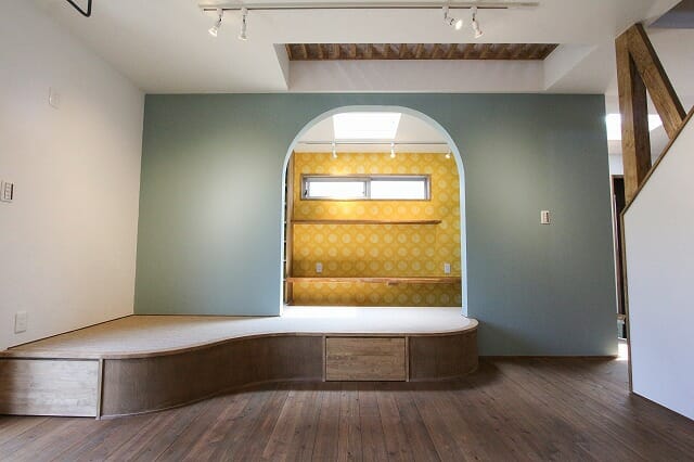 リビングはアールを使った小上がり、アーチのある黒板の壁など