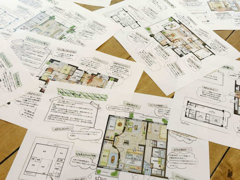 過去のリノベーション事例のビフォーアフターを手書きでまとめた特別な資料を無料で提供しています。忙しいお母さんでも、簡単にご利用いただけるよう配慮しました。