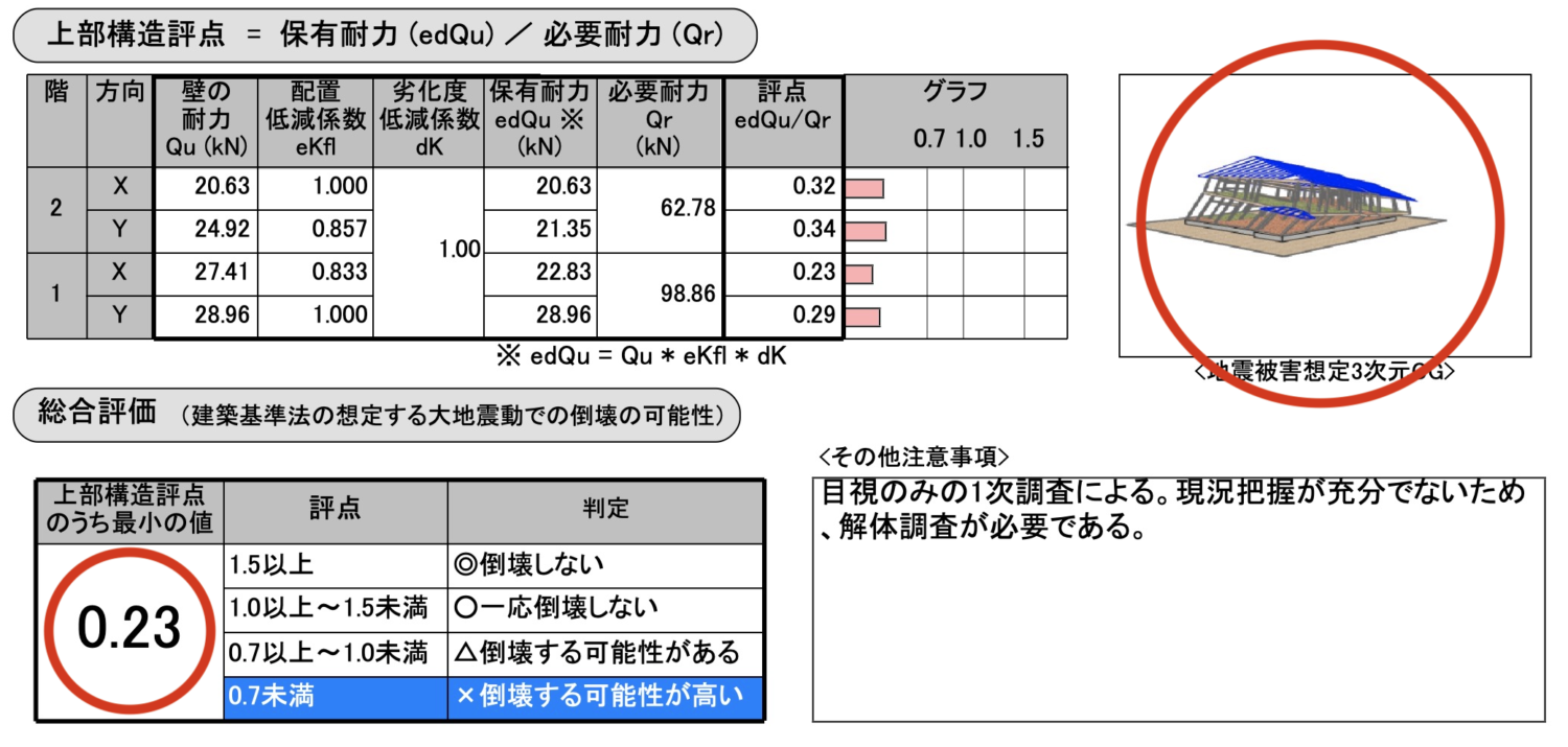 • リノベーション前の診断では、耐震評点が0.23という非常に低い値でした。このままでは、大きな地震に対して「倒壊する可能性が高い」と判断されます。このような状態では、安心して暮らすことはできません。